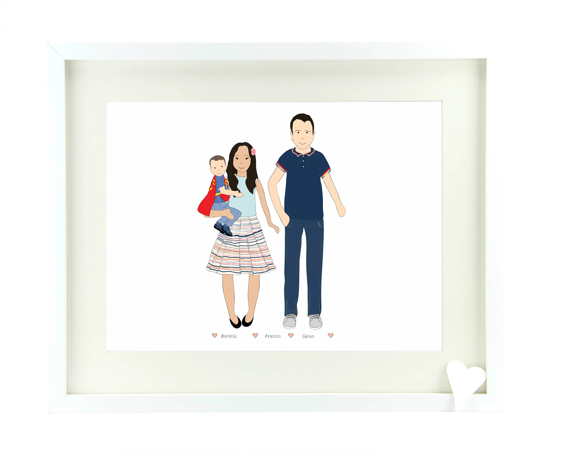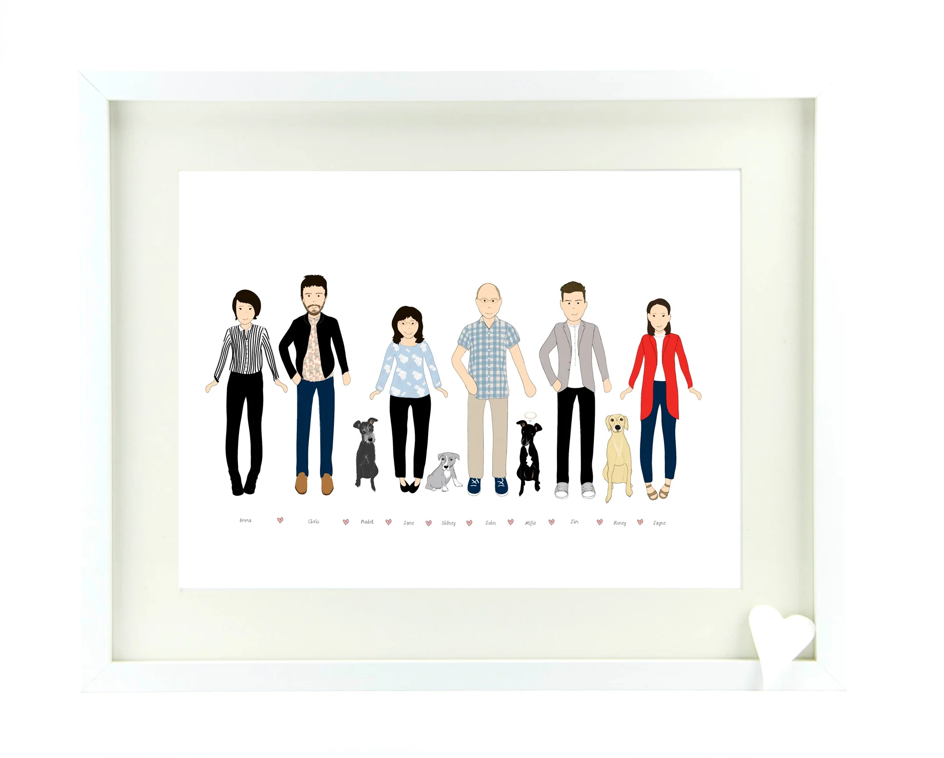 A perfect gift for any occasion. Birthday, Wedding, Christening, Valentines, New Home or just because! Your print is carefully & digitally hand drawn from photographs of those you would like to include.